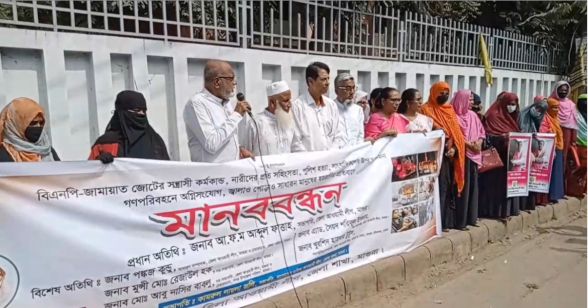 বিএনপি–জামায়াত জোটের সন্ত্রাসী কর্মকান্ড, নারীদের প্রতি সহিংসতা, পুলিশ হত্যা, সাংবাদিকদের উপর আক্রমন, গণ পরিবহনে অগ্নিসংযোগের প্রতিবাদে মাগুরা জেলা মহিলা আ.লীগ মানববন্ধন করেছে।