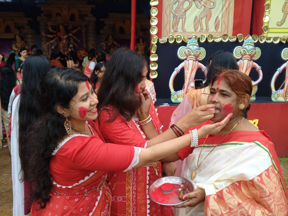 প্রথা অনুসারে বিবাহিত নারীরা দেবীর চরণে সিঁদুর অর্পণ করে তা নিজেদের সিঁথিতে পরিধান করেন এবং একে অপরের কপাল ও মুখে সিঁদুর লাগিয়ে দেন। বিশ্বাস করা হয়, এ আচার তাদের স্বামীর দীর্ঘায়ু ও পারিবারিক মঙ্গল বয়ে আনে। উৎসবের শেষ দিনে নারীদের হাসি, আনন্দ, শঙ্খধ্বনি ও উলুধ্বনিতে মুখর হয়ে ওঠে প্রতিটি পূজামণ্ডপ।