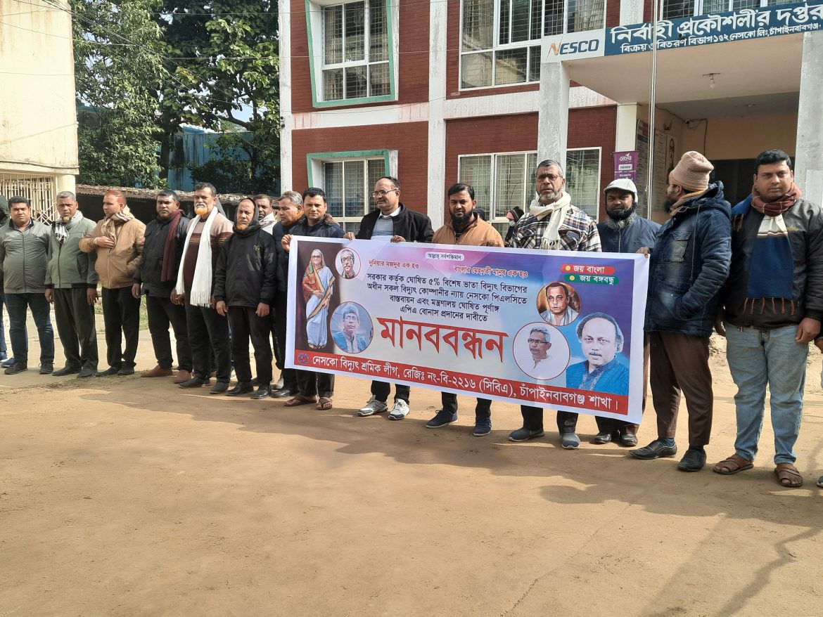 চাঁপাইনবাবগঞ্জ বিদ্যুৎ অফিসের কর্মচারীরা বিশেষ ভাতা ও বোনাসের দাবিতে মানববন্ধন করেছেন। সোমবার (২২ জানুয়ারি) সকালে জেলার নেসকো নির্বাহী প্রকৌশলীর দপ্তরের সামনে ঘন্টাব্যাপী এ কর্মসূচী পালিত হয়। এ মানববন্ধনের আয়োজন করে নেসকো বিদ্যুৎ শ্রমিক লীগ।