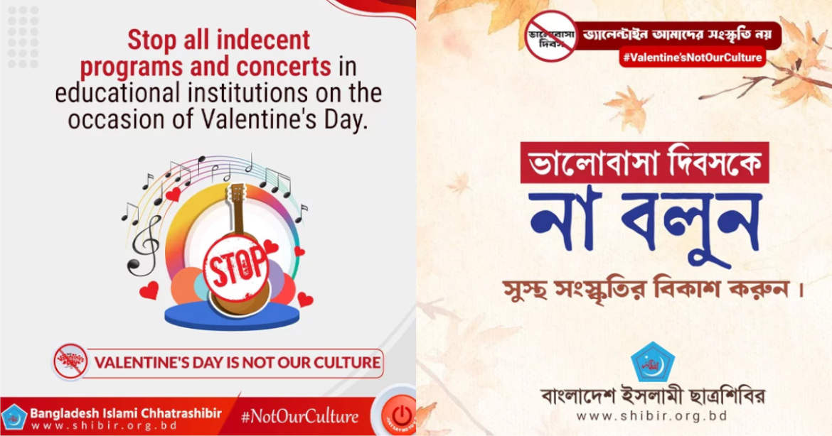 বাংলাদেশ ইসলামী ছাত্রশিবির ফেসবুক পেজে একটি ফটোকার্ড শেয়ার করা হয়। কার্ডে লেখা হয়েছে, “ভ্যালেন্টাইন আমাদের সংস্কৃতি নয়। ভালোবাসা দিবসকে না বলুন, সুস্থ সংস্কৃতির বিকাশ করুন।”