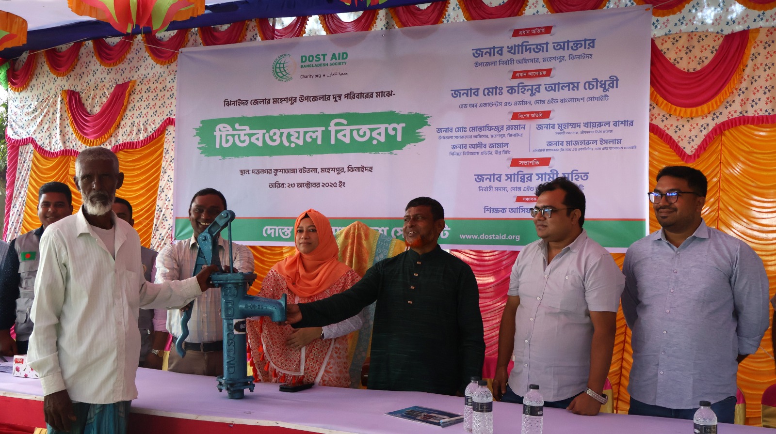 অসহায় মানুষের মাঝে সুপেয় পানি নিশ্চিত করতে ঝিনাইদহের মহেশপুর উপজেলায় বিনামূল্যে ৩০টি টিউবওয়েল বিতরণ করেছে সমাজসেবী সংগঠন দোস্ত এইড বাংলাদেশ সোসাইটি।