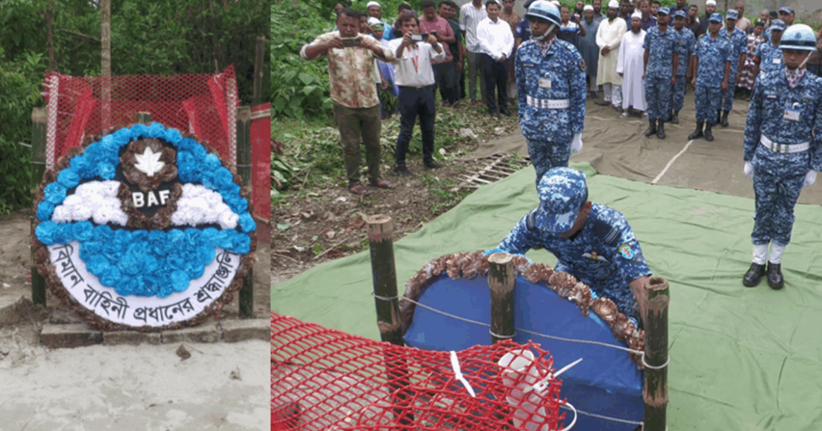 মাইলস্টোন স্কুল অ্যান্ড কলেজে যুদ্ধবিমান বিধ্বস্তে নিহত তৃতীয় শ্রেণির ছাত্রী রাইসা মনি‘র (৯) কবরে শ্রদ্ধা নিবেদন করলেন বাংলাদেশ বিমান বাহিনী সদস্যরা।