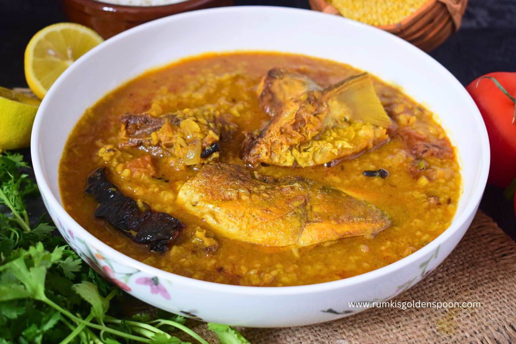 ১টি রুই মাছের মাথা, ১ কাপ মুগ ডাল, পরিমাণ মতো সর্ষের তেল, ২টি তেজপাতা, ২টি লবঙ্গ, ১টি দারচিনি, ২ টি এলাচ, ১টি পেঁয়াজ, ১টি টমেটো, ১চা চামচ আদা বাটা, ১চা চামচ রসুন বাটা, ১চা চামচ ঘি, ১টি শুকনো মরিচ, ১/২চা চামচ গোটা জিরা, ১চা চামচ জিরার গুঁড়া, ১চা চামচ হলুদ গুঁড়া, ১/২চা চামচ কাশ্মিরী মরিচ গুঁড়া, ১/২চা চামচ ধনে গুঁড়া, স্বাদ মত লবন, ২চা চামচ ধনে পাতা।