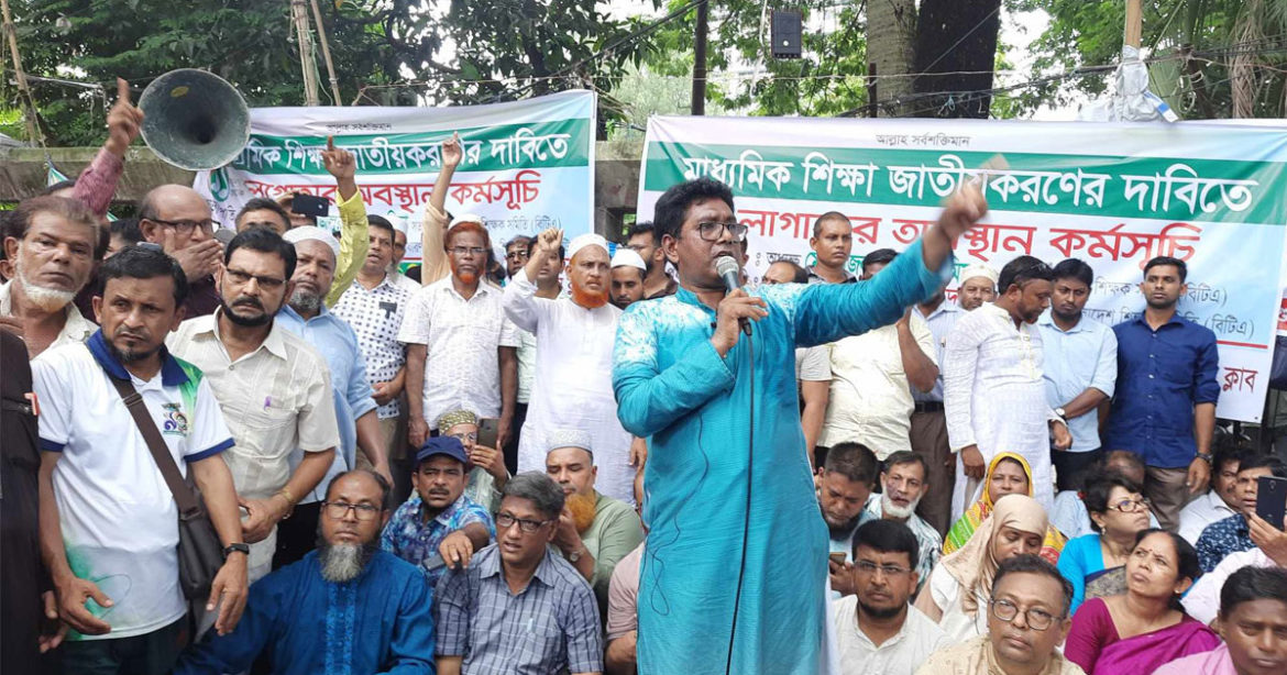 জাতীয় প্রেসক্লাবের সামনে লাগাতার অবস্থান কর্মসূচিতে এই ঘোষণা দেন বাংলাদেশ শিক্ষক সমিতির সাধারণ সম্পাদক শেখ কাওছার আহমেদ।