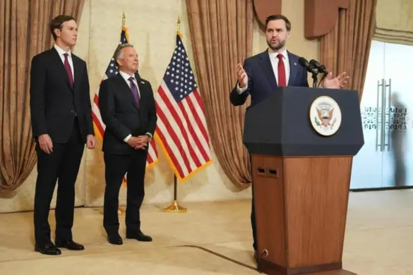 সংবাদ সম্মেলনে ভ্যান্সের পেছনে ছিলেন ট্রাম্পের জামাতা ও হোয়াইট হাউসের উপদেষ্টা জ্যারেড কুশনার এবং মধ্যপ্রাচ্যে নিযুক্ত যুক্তরাষ্ট্রের বিশেষ দূত স্টিভ উইটকফ, যারা ইরানের সঙ্গে আলোচনায় অংশগ্রহণকারী মার্কিন প্রতিনিধিদলের সদস্য ছিলেন।