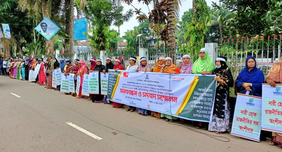 মানববন্ধনে বাংলাদেশ মহিলা পরিষদ সাংগঠনিক সম্পাদক খালেদা আক্তার হেনা, উদীচি শিল্পী গোষ্ঠির খালিদ আবু, পৌরসভার কাউন্সিলর আব্দুস সালাম বাতেন এবং বিভিন্ন উপজেলা থেকে আগত নারী জনপ্রতিনিধিরা বক্তব্য দেন।