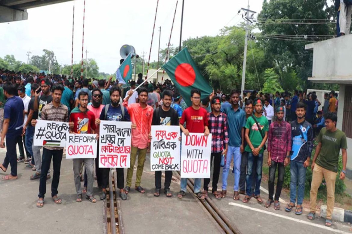 সরকারি চাকরিতে কোটা পদ্ধতি সংস্কারের দাবিতে রাজশাহীর বিশ্ববিদ্যালয়ের স্টেশনের রেললাইনে রাজশাহী-ঢাকা রেললাইন অবরোধ করে বিক্ষোভ করছে শিক্ষার্থীরা।