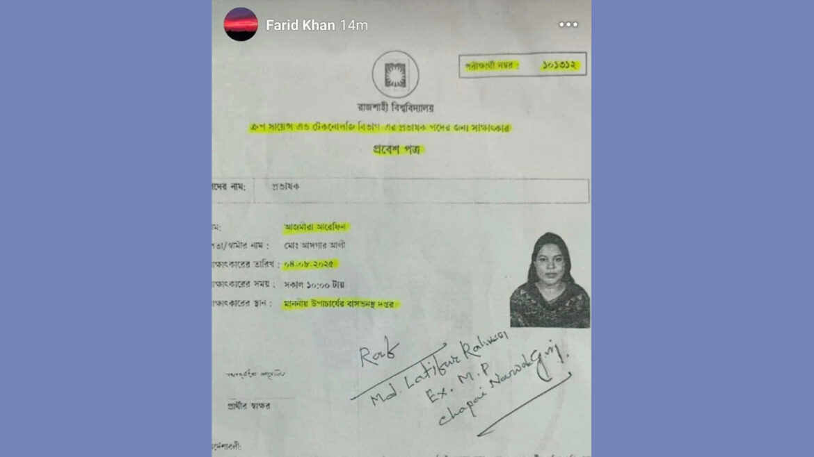 রাজশাহী বিশ্ববিদ্যালয়ের উপ–উপাচার্য (শিক্ষা) অধ্যাপক ড. ফরিদ উদ্দীন খানের ফেসবুক স্টোরিতে শিক্ষক নিয়োগে জামায়াতের সাবেক এমপির সুপারিশ করা প্রবেশপত্র দেখা গেছে। স্টোরি ১৫ মিনিট পরেই ডিলিট করে দেন অধ্যাপক ফরিদ। তবে এটুকু সময়ের মধ্যেই সেই স্টোরির স্ক্রিনশট সামাজিক যোগাযোগমাধ্যমে ছড়িয়ে পড়ে। এ নিয়ে শুরু হয় ব্যাপক সমালোচনা।