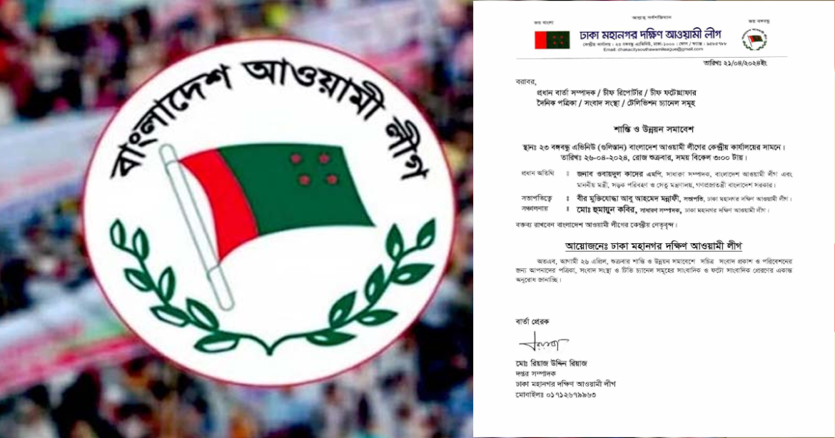 ঢাকা মহানগর দক্ষিণ আওয়ামী লীগের উদ্যোগে শুক্রবার (২৬ এপ্রিল) বিকেলে শান্তি ও উন্নয়ন সমাবেশ করবে আওয়ামী লীগ।