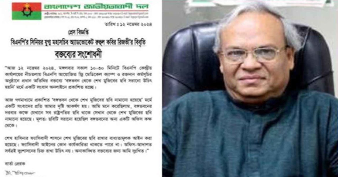 বঙ্গভবন থেকে শেখ মুজিবুর রহমানের ছবি সরানো নিয়ে করা মন্তব্যের সংশোধনী দিয়েছেন বিএনপি সিনিয়র যুগ্ম মহাসচিব রুহুল কবির রিজভী।