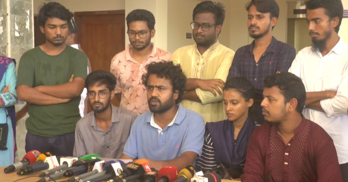 সংবাদ সম্মেলনে লিখিত বক্তব্য পাঠ করেন সাধারণ শিক্ষার্থীদের পক্ষে বরিশাল বিশ্ববিদ্যালয়ের (ববি) শিক্ষার্থী সুজয় শুভ।
