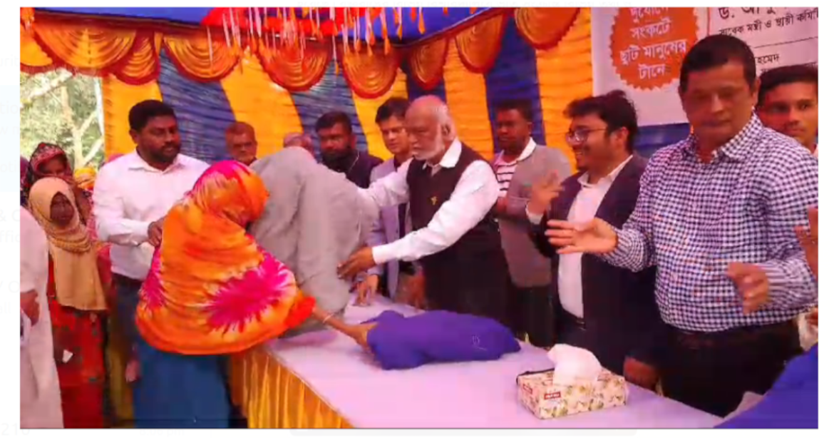 অনুষ্ঠান শেষে সুবিধাবঞ্চিত স্থানীয়দের হাতে শীতবস্ত্র তুলে দেন মঈন খান।