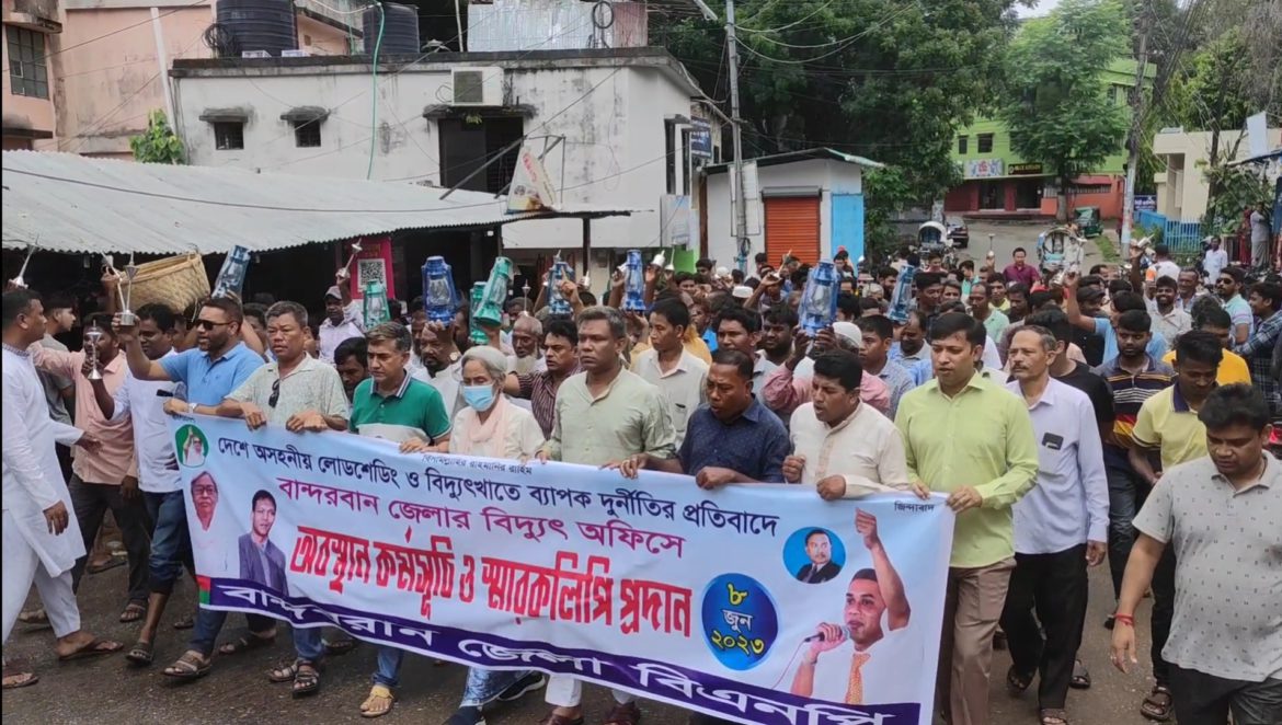 সকালে জজ কোর্টের সামনে থেকে হারিকেন ও কুপি বাতি হাতে নিয়ে একটি বিক্ষোভ মিছিল বের করে বিএনপি ও এর অঙ্গ সংগঠন। মিছিলটি প্রধান প্রধান সড়ক প্রদক্ষিণ শেষে বান্দরবান বিদ্যুৎ অফিসের সামনে গিয়ে শেষ হয়। পরে সেখানে অবস্থান কর্মসূচি পালন করে তারা। সেখানে বক্তব্য রাখেন বান্দরবান জেলা বিএনপির সভাপতি ম্যামাচিং, সাধারণ সম্পাদক জাবেদ রেজাসহ বিএনপির অঙ্গসংগঠনের নেতাকর্মীরা।