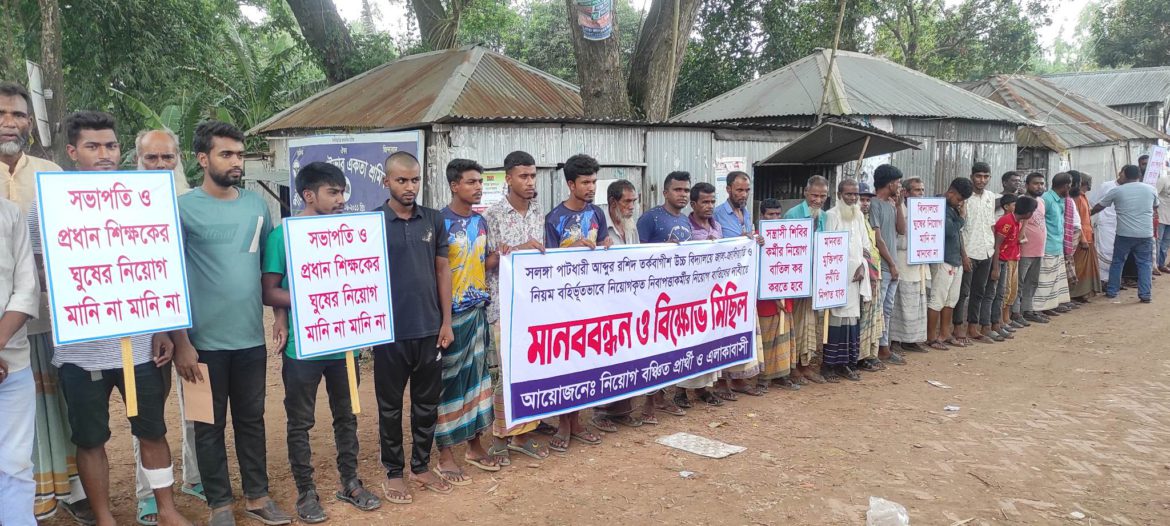 বক্তরা বলেন, উল্লাপাড়া উপজেলার মাওলানা আব্দুর রশীদ তর্কবাগিশ উচ্চ বিদ্যালয়ের প্রধান শিক্ষক আব্দুল মালেক ও সভাপতি মামুনুর রশিদ জাল জালিয়াতির মাধ্যমে চলতি বছরের ১৪ মে নিরাপত্তাকর্মী পদে নিয়োগ প্রদান করেন। গোপনে নিয়মনীতি অমান্য করে মোটা অংকের অর্থের বিনিময়ে প্রধান শিক্ষক ও সভাপতি তাদের পছন্দের প্রার্থীকে নিয়োগ দিয়েছেন। নিয়োগ বঞ্চিত প্রার্থী শারীরিক প্রতিবন্ধি আরিফুল ইসলামকে নিয়োগ পরীক্ষার প্রবেশ পত্র দেয়া হয়নি।