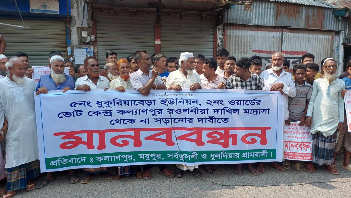 মানববন্ধন ও বিক্ষোভ কর্মসূচিতে গ্রামবাসীরা বলেন, স্বাধীনতার পর থেকে আমরা এই তিন গ্রামের বাসিন্দারা কল্যাণপুর রওশনিয়া দাখিল মাদ্রাসা কেন্দ্র ভোট দিয়ে আসছি। কিন্তুু কতিপয় মানুষ জাল জালিয়াতি করে মিথ্যা অভিযোগ দিয়ে আমাদের ভোট কেন্দ্র স্থানান্তরের পায়তারা করছে। প্রায় ৪ কিলোমিটার দূরে ধুলদিয়ার সরকারি প্রাথমিক বিদ্যালয়ে আমাদের ভোটকেন্দ্র নির্ধারণ করা হয়েছে।
