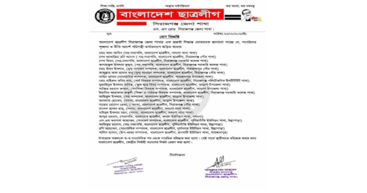 অব্যাহতি প্রাপ্ত নেতারা হলেন, (১) মোঃ আল আমিন–সহ সভাপতি সলঙ্গা থানা ছাত্রলীগ (২) শেখ জাকারিয়া রনি আনন্দ, সহ সভাপতি, সিরাজগঞ্জ পৌর ছাত্রলীগ (৩) শেখ রিমন–সহ সভাপতি, সিরাজগঞ্জ সরকারি কলেজ ছাত্রলীগ (৪) আশরাফুল ইসলাম কুদ্দুস, সহ সভাপতি–সিরাজগঞ্জ সরকারি কলেজ (৫) মোঃ বাদন ইসলাম, যুগ্ন সাধারণ সম্পাদক, শাহজাদপুর পৌর শাখা,(৬)আব্দুল্লাহ হাসান তপু, যুগ্নসাধারণ সম্পাদক, সিরাজগঞ্জ পৌর শাখা (৭) নাইদ হাসান,সাংগঠনিক সম্পাদক, শাহজাদপুর উপজেলা ছাত্রলীগ (৮)খায়রুল কবির খান, অর্থ বিষয়ক সম্পাদক, সিরাজগঞ্জ পলিটেকনিক ছাত্রলীগ (৯) মোজাহিদুল ইসলাম মানিক, স্কুল ছাত্র বিষয়ক সম্পাদক, তাড়াশ উপজেলা ছাত্রলীগ (১০) সাব্বির রহমান রোমান, গণশিক্ষা বিষয়ক সম্পাদক, তাড়াশ উপজেলা ছাত্রলীগ, (১১) ইয়াসিন আরাফাত রুকুনি, শিক্ষা ও পাঠচক্র সম্পাদক, সিরাজগঞ্জ সরকারি কলেজ ছাত্রলীগ (১২)আরিফুল ইসলাম, সহ সম্পাদক, তাড়াশ উপজেলা ছাত্রলীগ (১৩) আসলাম হোসেন, সদস্য তাড়াশ উপজেলা ছাত্রলীগ (১৪) সায়েম হোসেন রেজা, সদস্য, সিরাজগঞ্জ পৌর ছাত্রলীগ (১৫) রাসেল হাসান রাসু, সদস্য, সলঙ্গা থানা ছাত্রলীগ (১৬) নাইমুল ইসলাম নয়ন, সদস্য, সলঙ্গা থানা ছাত্রলীগ (১৭) আব্দুর রহমান–সভাপতি, নলকা ইউনিয়ন ছাত্রলীগ (১৮) এস এম ফয়সাল আহম্মেদ–সাধারণ সম্পাদক পূর্নিমাগাতি ইউনিয়ন ছাত্রলীগ (১৯) আতিকুর রহমান, সহ সভাপতি, পূর্নিমাগাতী ইউনিয়ন ছাত্রলীগ (২০) রনি আহমেদ, সাংগঠনিক সম্পাদক, দর্গা নগর ইউনিয়ন ছাত্রলীগ, (২১) খালিদ হাসান, উপ প্রচার সম্পাদক, রুপবাটি ইউনিয়ন ছাত্রলীগ।