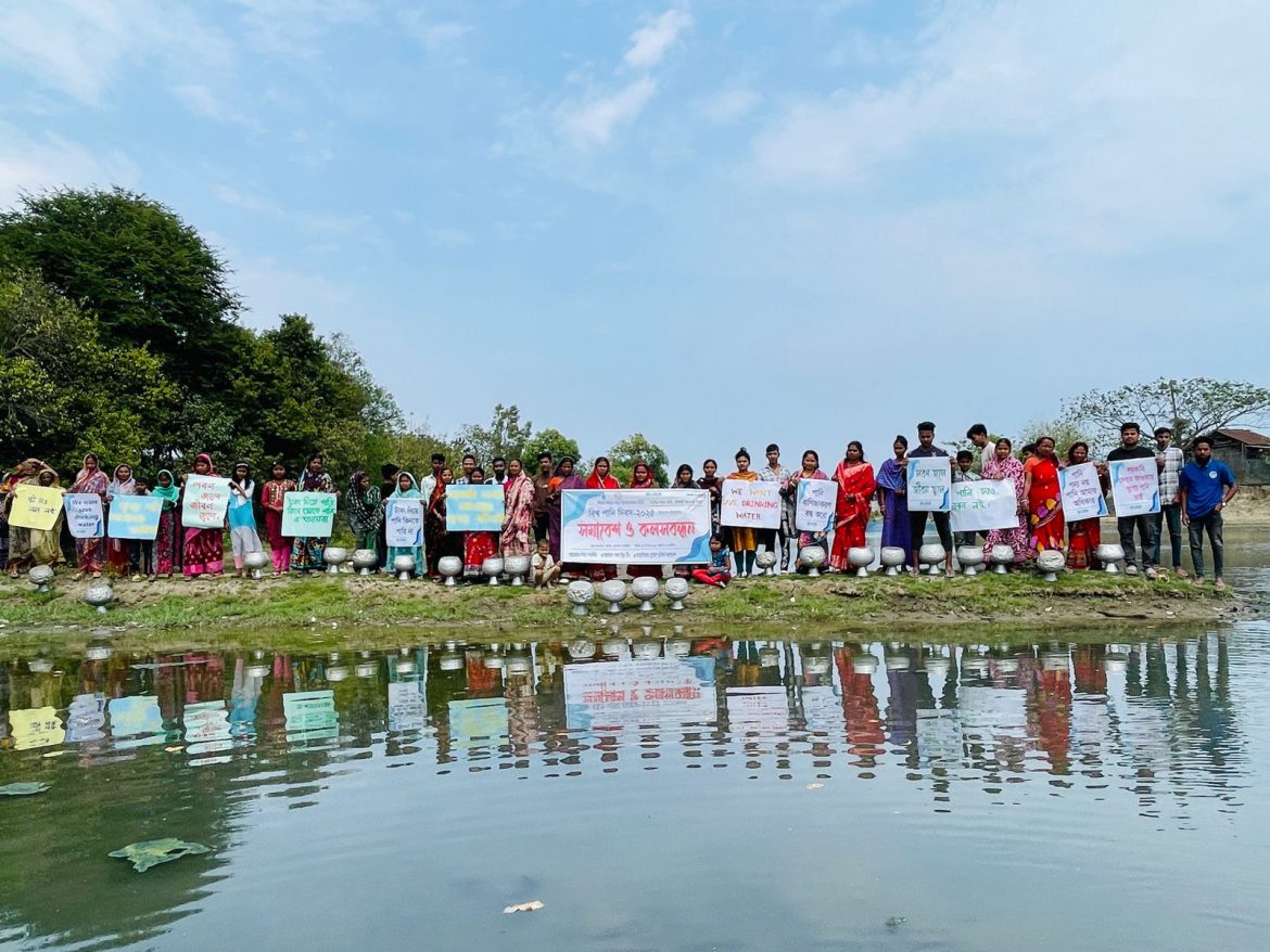 এ সময় স্থানীয় শতাধিক গৃহিণীরা পানির কলস নিয়ে নদীর তীরে অবস্থান নেন। কলস বন্ধনে তারা টাকা দিয়ে পানি কিনে খেতে চাই না, পানি বাণিজ্যিকরণ বন্ধ করো “আর কতকাল লবণ পানি খেতে হবে?” সহ বিভিন্ন প্রতিবাদ সম্বলিত ব্যানার ফেস্টুন হাতে নিয়ে নিজেদের দাবিগুলো তুলে ধরেন। মানববন্ধনে শতাধিক নারী–পুরুষের উদ্দেশে বক্তব্য দেন শরুব ইয়ুথ টিমের নির্বাহী পরিচালক এস এম জান্নাতুল নাঈম।