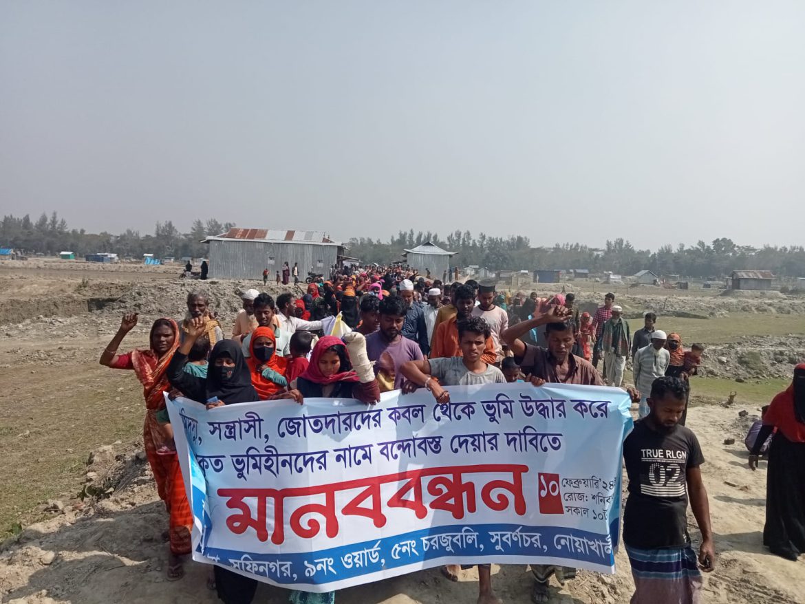 নোয়াখালীর সুবর্ণচরে ভূমিদস্যুদের কবল থেকে ভূমি উদ্ধার করে প্রকৃত ভূমিহীনদেন নামে বন্দোবস্ত দেয়ার দাবিতে মানববন্ধন ও বিক্ষোভ মিছিল হয়েছে।