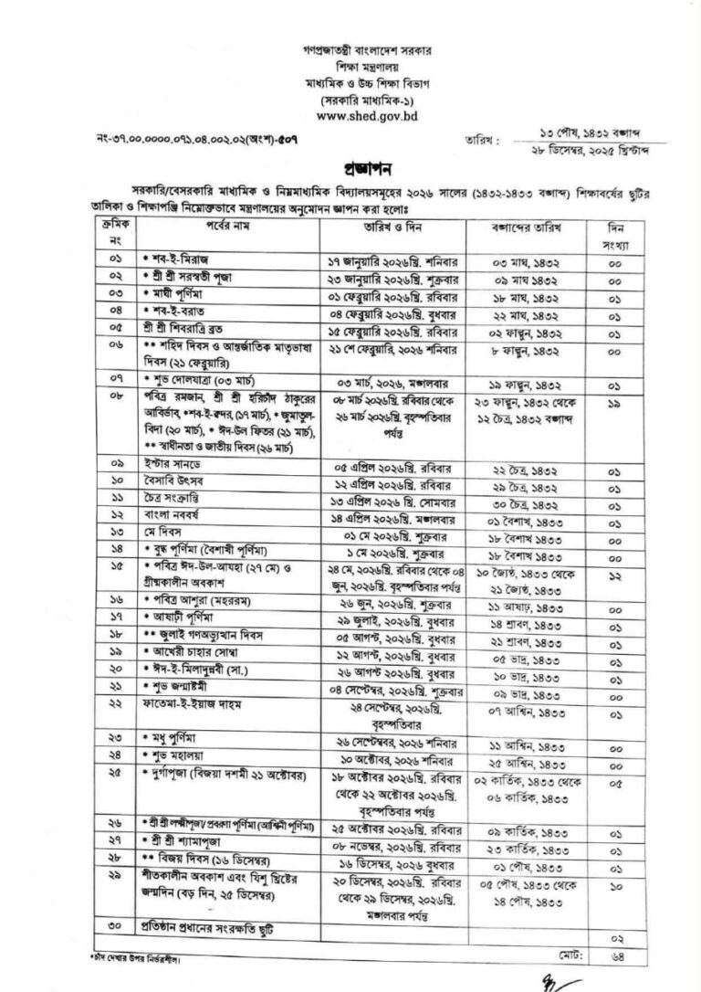 ২০২৬ সালে দেশের সরকারি ও বেসরকারি মাধ্যমিক ও নিম্নমাধ্যমিক বিদ্যালয়ের ছুটি তালিকা প্রকাশ করেছে শিক্ষা মন্ত্রণালয়। এতে ১২ দিন ছুটি কমানো হয়েছে। বাতিল করা হয়েছে শবে মেরাজ, জন্মাষ্টমী, আশুরাসহ বেশ কয়েক দিনের ছুটি।