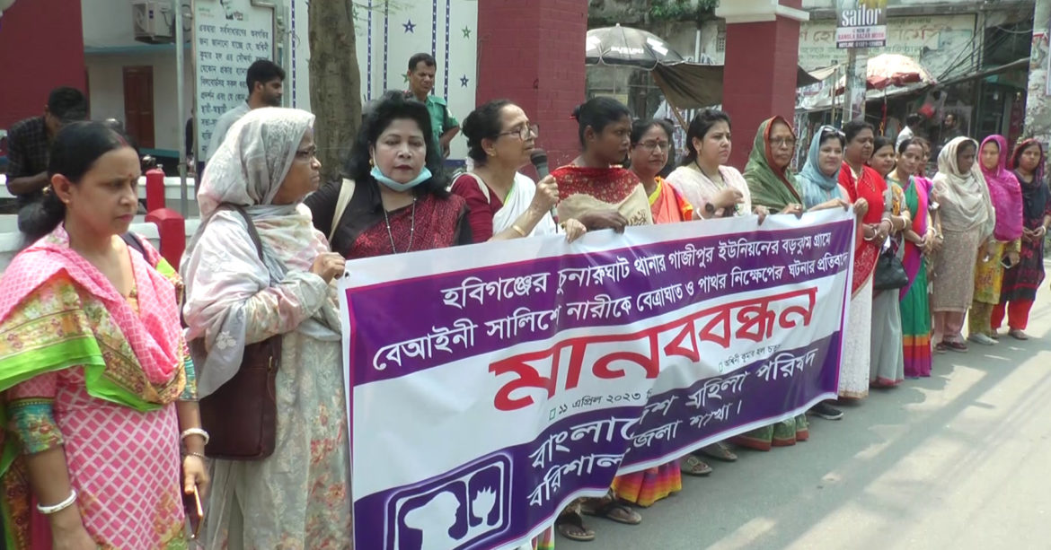 হবিগঞ্জে নারীকে বেত্রাঘাত-পাথর নিক্ষেপের প্রতিবাদে বরিশালে মানববন্ধন