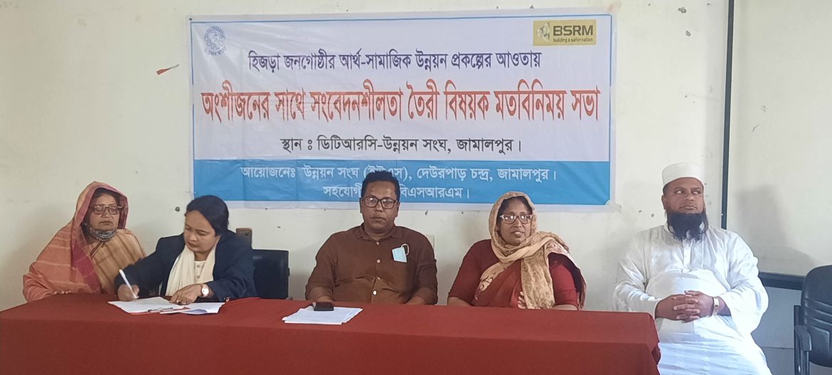 জামালপুর জেলার হিজড়া জনগোষ্ঠীর জীবিকার নিরাপত্তা ও সামাজিক মর্যাদা বৃদ্ধি করার লক্ষ্যে হিজড়াদের আর্থসামাজিক উন্নয়ন প্রকল্পে সম্পৃক্ত অংশীজনদের সাথে মতবিনিময় সভা অনুষ্ঠিত হয়েছে।